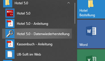 Falls das nicht hilft, haben Sie möglicherweise den Datenpfad verändert, und der von Ihnen in der Registrierung vorgegebene Pfad ist nicht verfügbar. Um den Datenpfad auf die Grundeinstellung zurückzusetzen gehen Sie wie folgt vor: Beenden Sie über den Taskmanager (Strg + Alt + Entf gleichzeitig drücken) alle Prozesse, die mit dem Namen "Hotel 5.0" laufen sollten, oder starten Sie den Rechner einmal neu. Klicken Sie anschließend auf den Startbutton von Windows und wählen Sie "alle Programme", bei Windows 10 auf alle Apps . Wähen Sie den Ordner "Hotel 5.0". Starten Sie die Anwendung "Hotel 5.0 - Datenwiederherstellung"